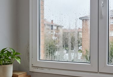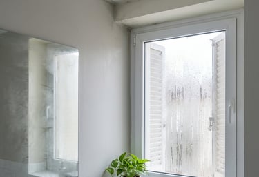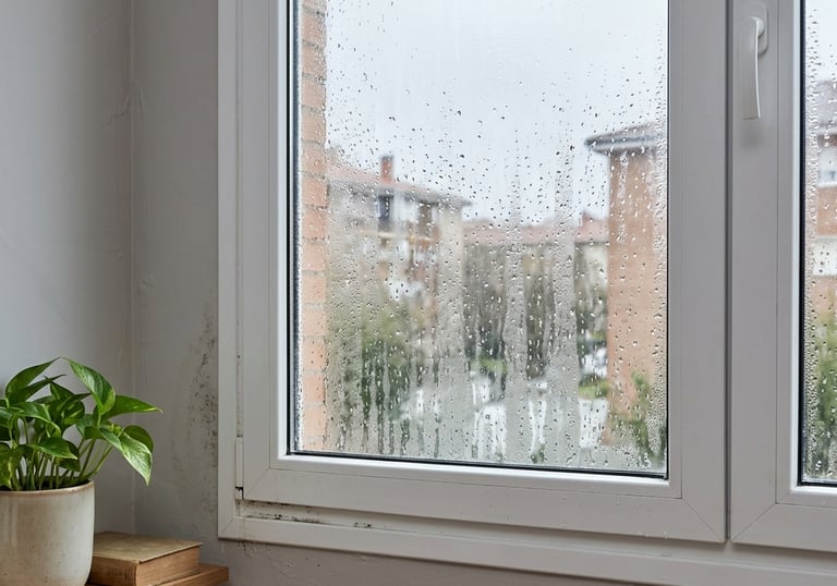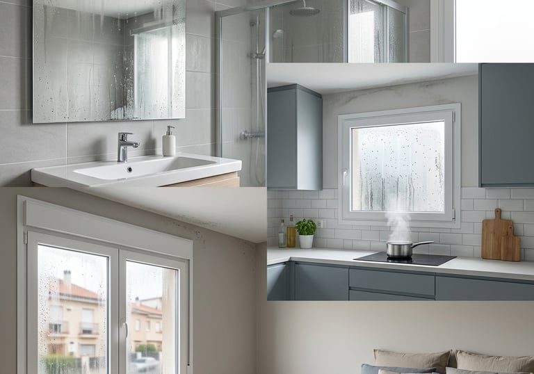 La condensación se produce cuando el vapor de agua del ambiente entra en contacto con superficies frías. Es habitual en ventanas, esquinas, techos y habitaciones con poca ventilación como baños, cocinas o dormitorios.